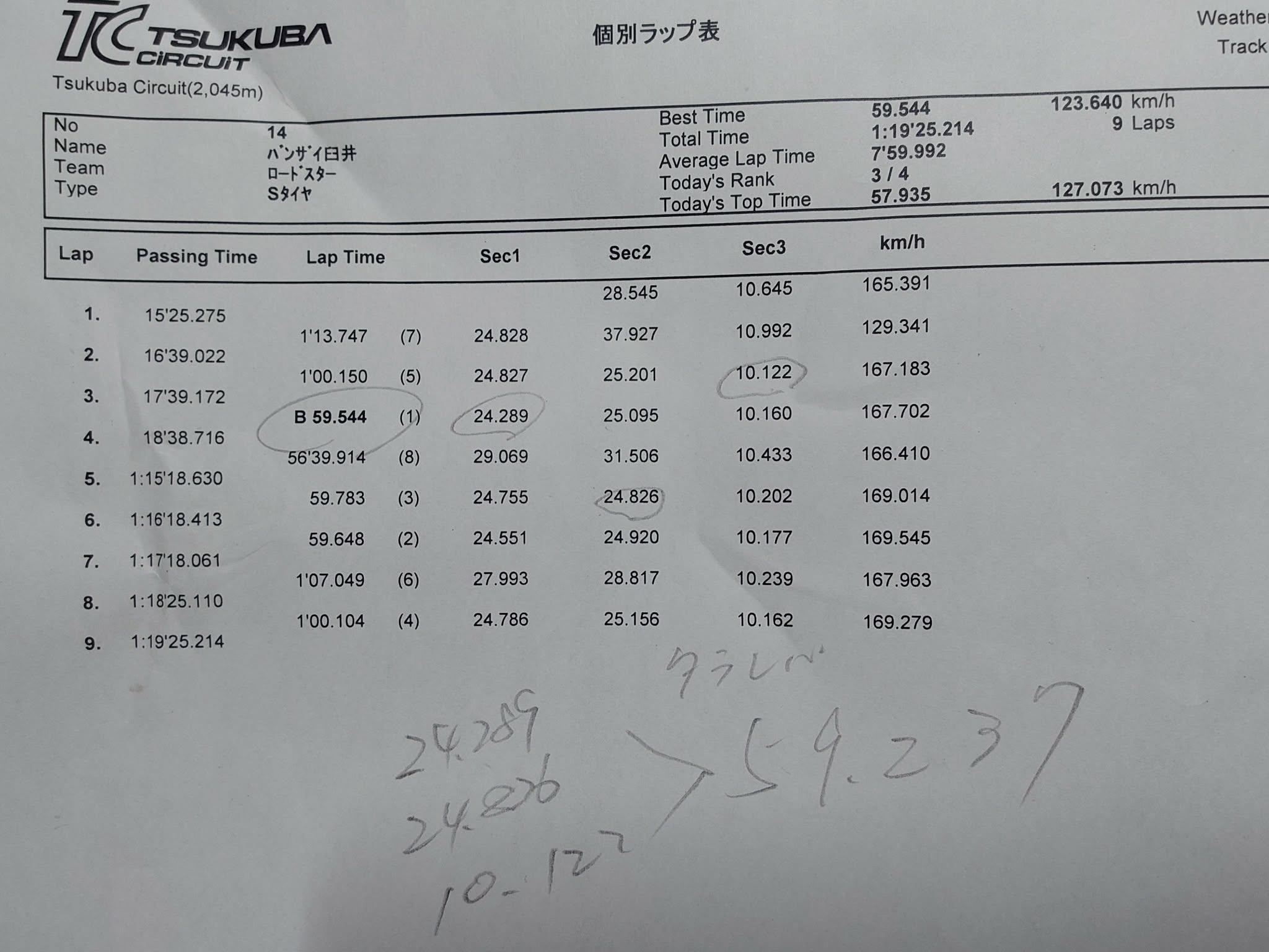 タイムは59秒5といつもと同じなんですがアタック中に電源が落ちるトラブルでセクター2でコンマ2秒ほど失ってしまいました。タラレバで59秒2なので調子は悪くないと思いたい( ̄(工) ̄)